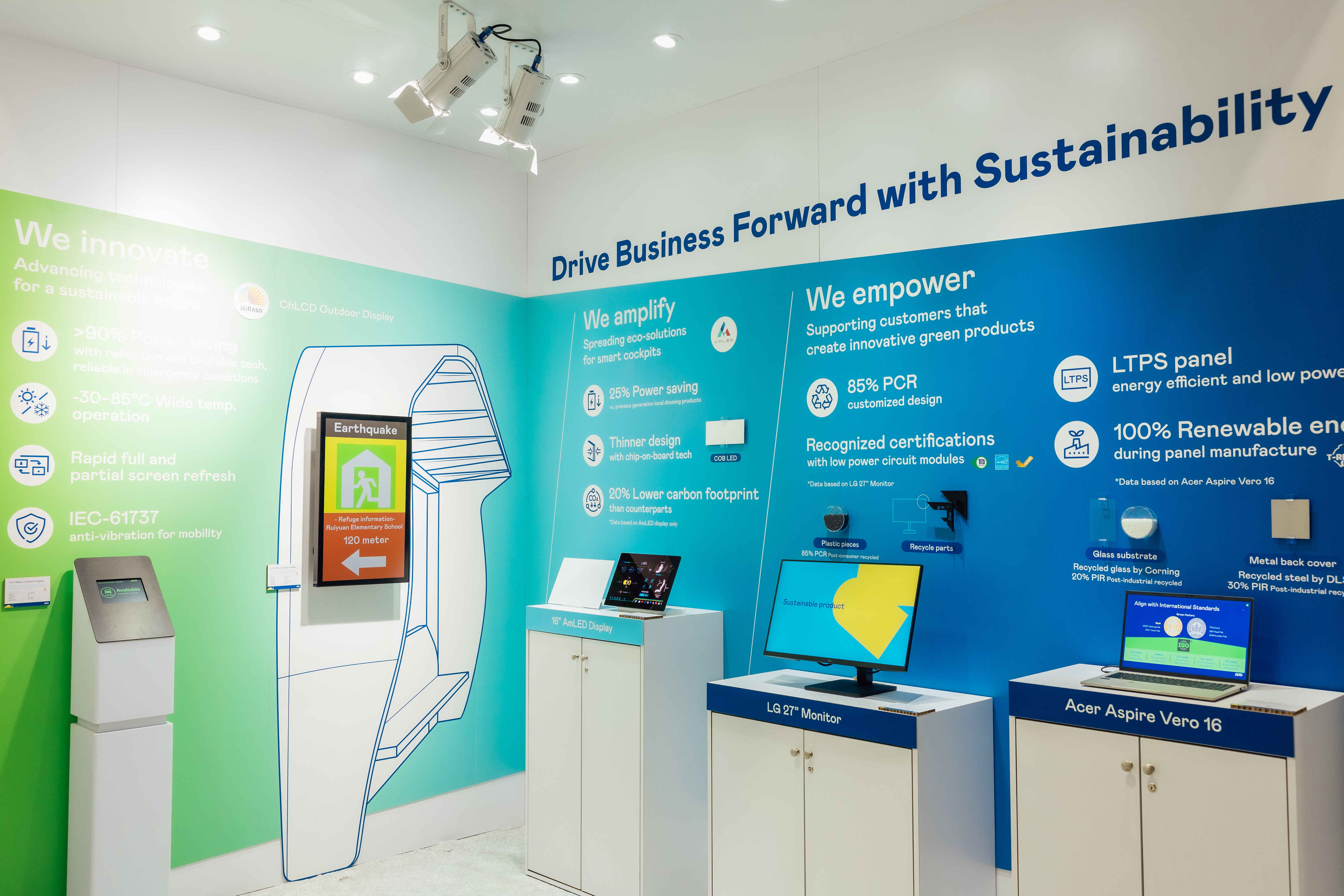 8868体育运用创新显示技术HiRaso胆固醇液晶双稳态技术达到显示零耗能、扩大节能省电的AmLED显示技术应用于车用产品、以再生的消费后回收(PCR)塑料及全绿电生产之面板,应用于笔电及萤幕,增加绿色价值。